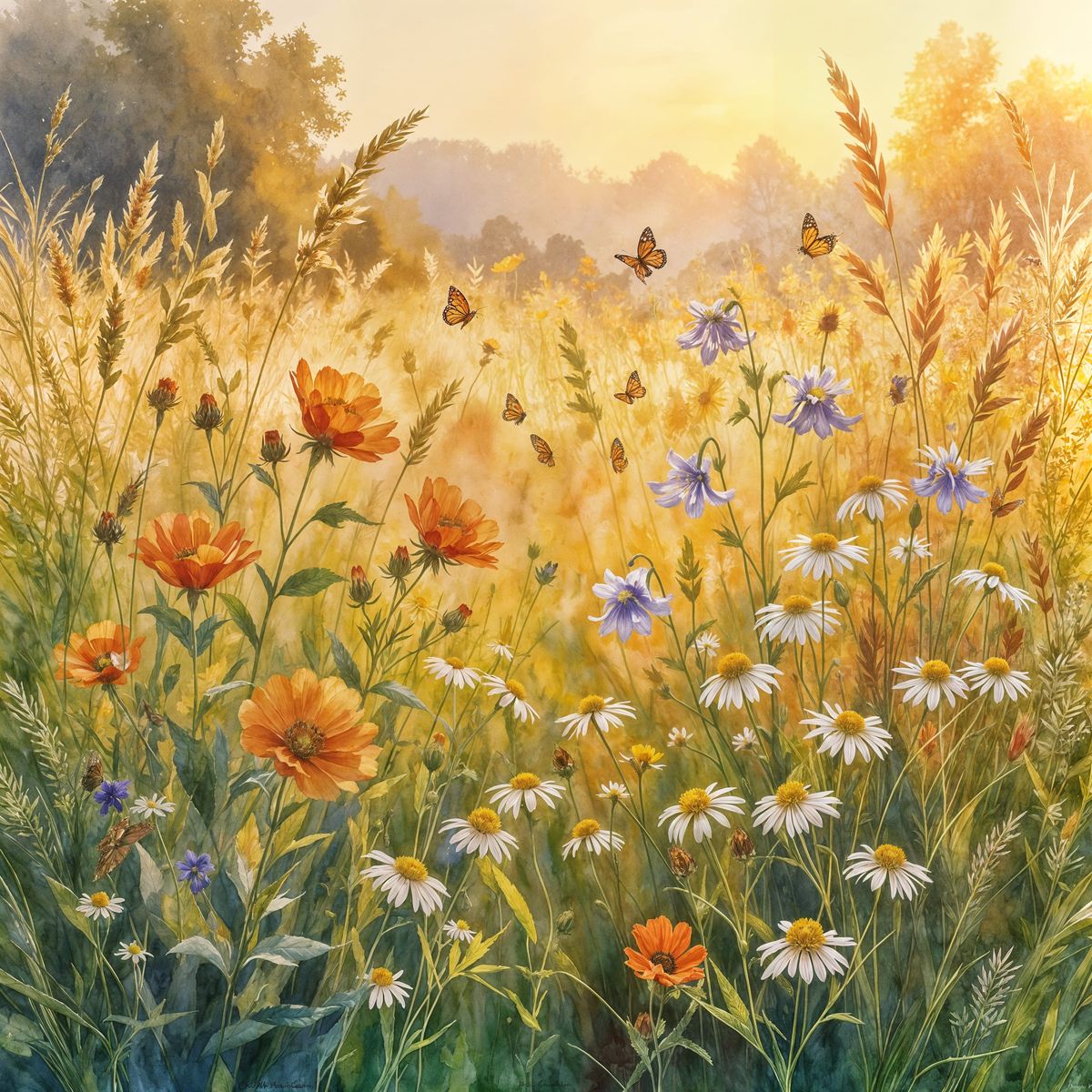 This image shows a sun-drenched wildflower meadow with vibrant poppies, daisies, and cornflowers, painted with soft washes of color in a serene, whimsical style.