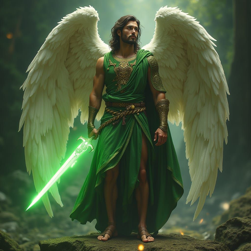 This image depicts a powerful archangel standing proudly, wielding a shining green light sword and adorned in detailed green clothing with golden accents. The artwork showcases a blend of traditional and cutting-edge techniques, featuring a rich color palette and intricate details.