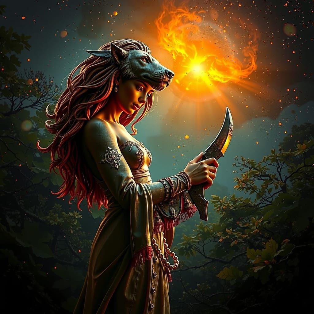 This image shows a sculpture rendered in hyperrealism with dynamic, colorful illumination. The artwork features intense lighting and intricate textures, resulting in a visually striking composition.