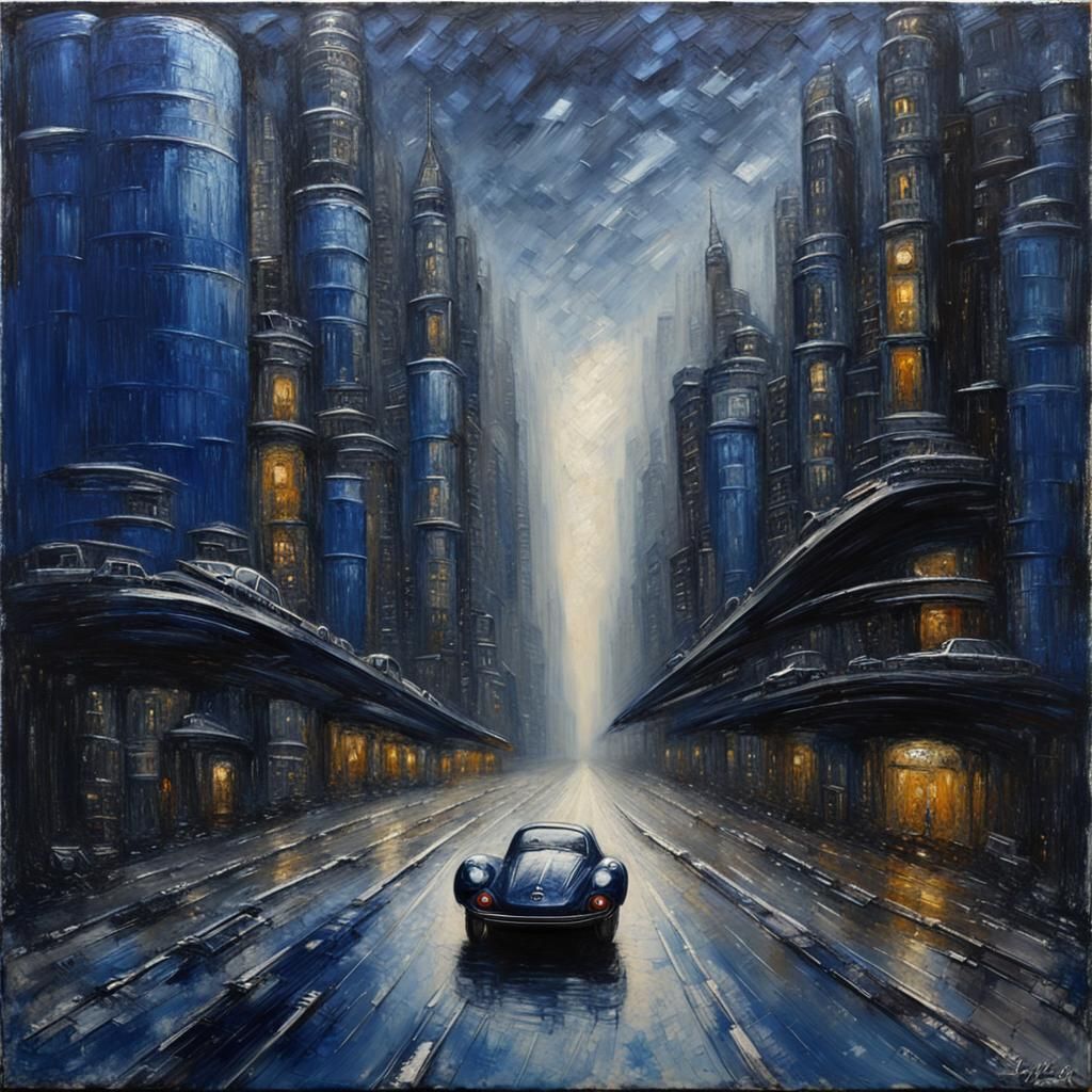 A futuristic city rendered as an encaustic painting in dark blue and silver, complete with a flying car. The impasto technique creates depth through textured wax layers.
