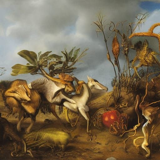 This image shows whimsical creatures enjoying a summer rain shower, reminiscent of classic baroque paintings combined with claymation aesthetics.