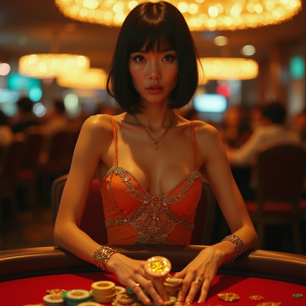 A striking image of a woman in a teal and orange gown at a casino poker table, surrounded by gold. The scene evokes intense drama and cinematic noir flair with warm, golden lighting.