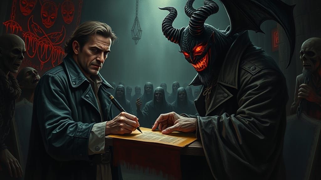 A haunting dark fantasy painting of a man signing a mysterious and ominous contract with a demonic figure. The man's face is filled with