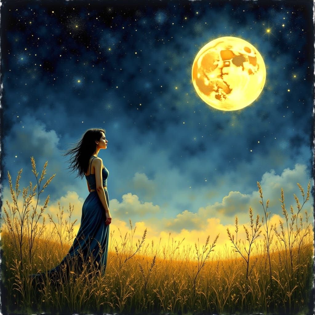 A woman in a meadow admires a full moon on a summer night. The scene evokes a dreamy pre-Raphaelite painting with vibrant colors, soft brushstrokes, and shimmering light.