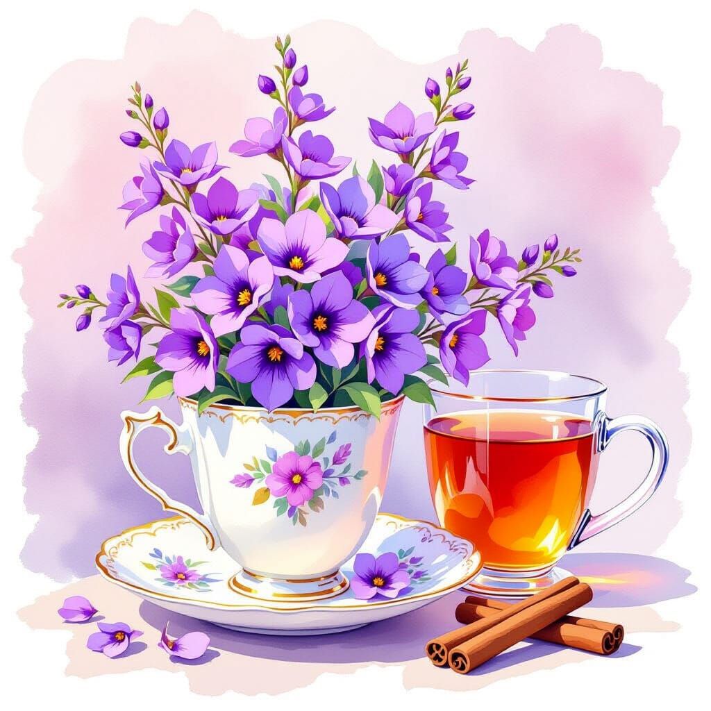 This image shows a porcelain cup with purple flowers on a saucer. A glass mug of amber tea and cinnamon stick sit nearby. The image is rendered in watercolor.