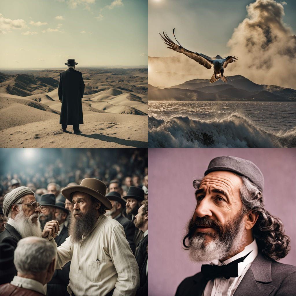 This image shows a cinematic film still of a Jewish man wearing tefillin giving a speech to a non-Jewish assembly. The image is atmospheric, with film grain and cinematic lighting.