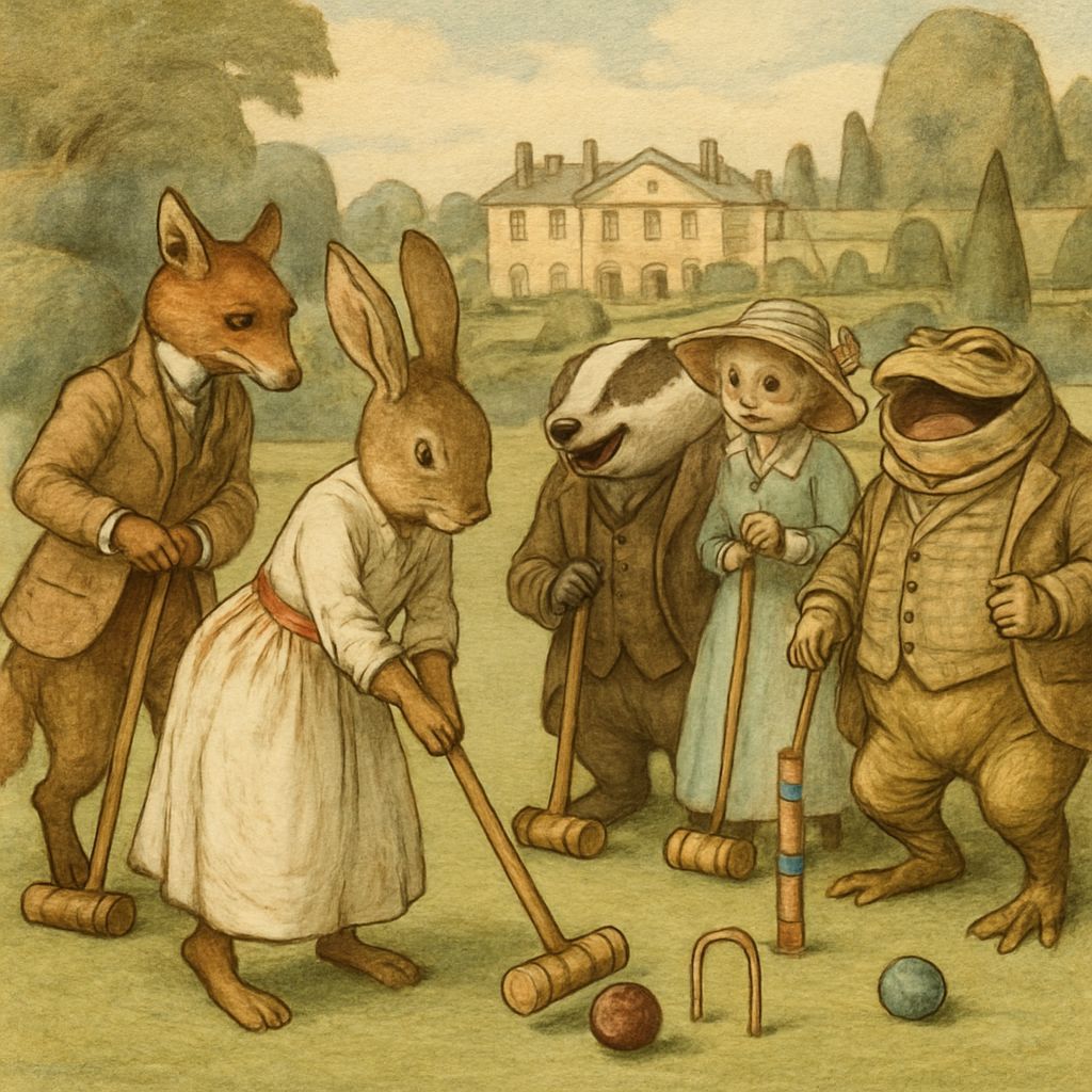 This image shows a whimsical scene of anthropomorphic animals playing croquet on a lush lawn. Dressed in Victorian attire, the animals display varied emotions in a pastel color palette, reminiscent of early 20th-century storybook illustrations.