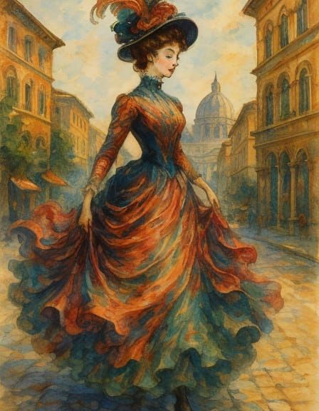 This image shows a graceful Victorian lady in a flowing dress, set against a vibrant, vintage Roman street. The watercolor illustration captures the motion and energy of the scene.