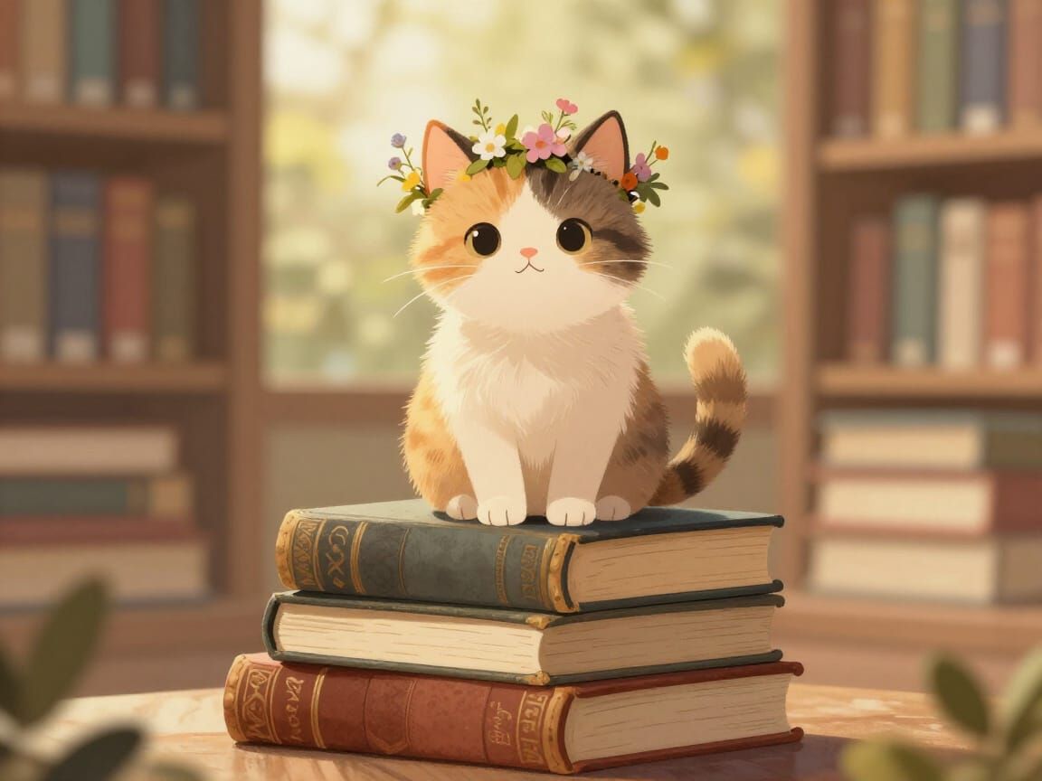 This image shows a cat wearing a wildflower crown, perched on old books in a sunlit library. Rendered in a charming storybook illustration style with warm colors.