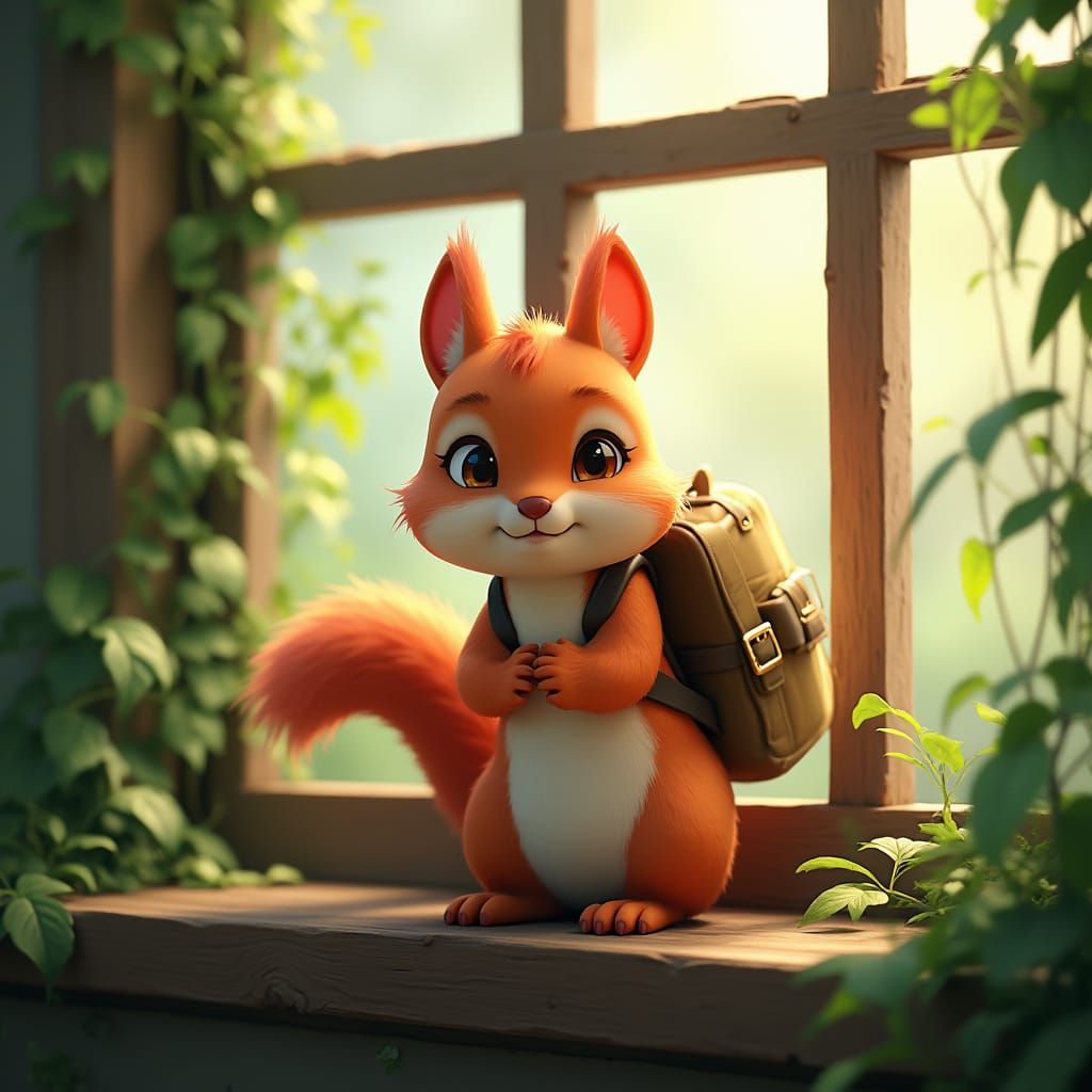This vibrant 3D anime image shows a red ground squirrel in a cozy pose, surrounded by lush greenery on a rustic windowsill, with intricate details and textures, reminiscent of Genshin Impact's art style.