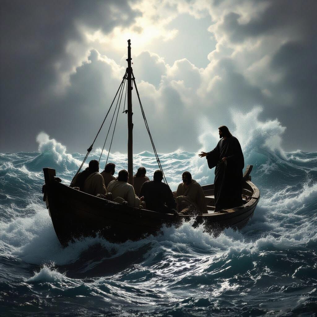 This hyperrealistic 4K image shows Jesus as a silhouette calming a stormy sea from a wooden boat with disciples. Intense detail and chiaroscuro lighting evoke Caravaggio's dramatic style.