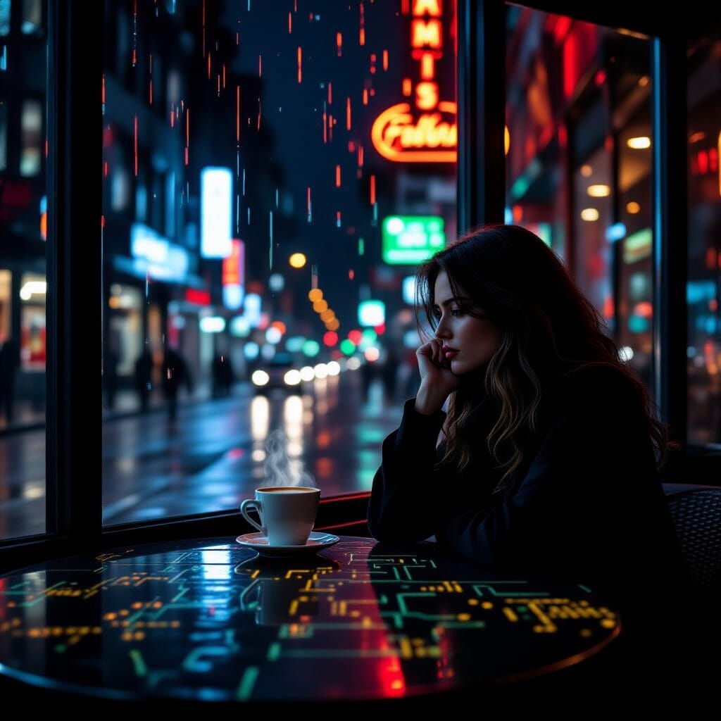 This photorealistic image shows a woman at a dimly lit cafe, with rain-slicked streets and neon signs outside. Subtle digital patterns appear on the table, captured with a grainy, cinematic film look.