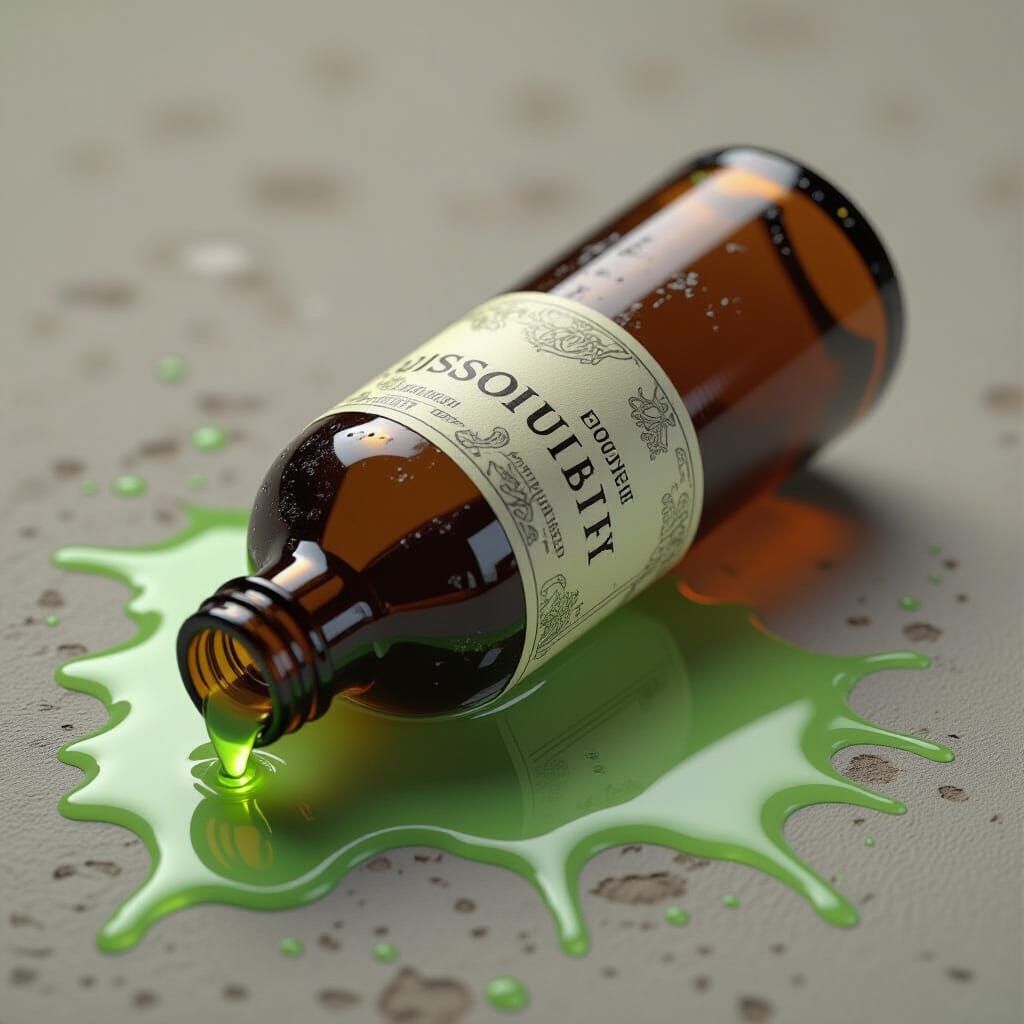 This image shows an old brown bottle leaking glowing green liquid across a surface. The digital painting features intricate details, subtle imperfections, and complex lighting for a realistic yet otherworldly scene.