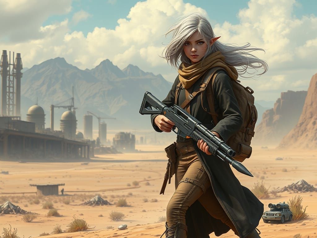 A young female warrior traverses a desolate wasteland, clad in a dark coat and backpack, with a shotgun at the ready, set against a backdrop of a ruined city and distant mountains in a blend of futuristic and dystopian landscapes.