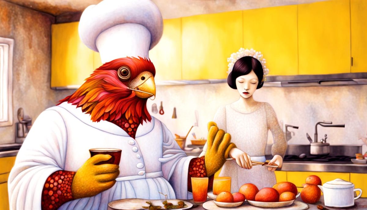 This image features a dreamlike creature that is a hybrid of a woman and a bird, rendered in a detailed and intricate art brut style with delicate pastel colors.
