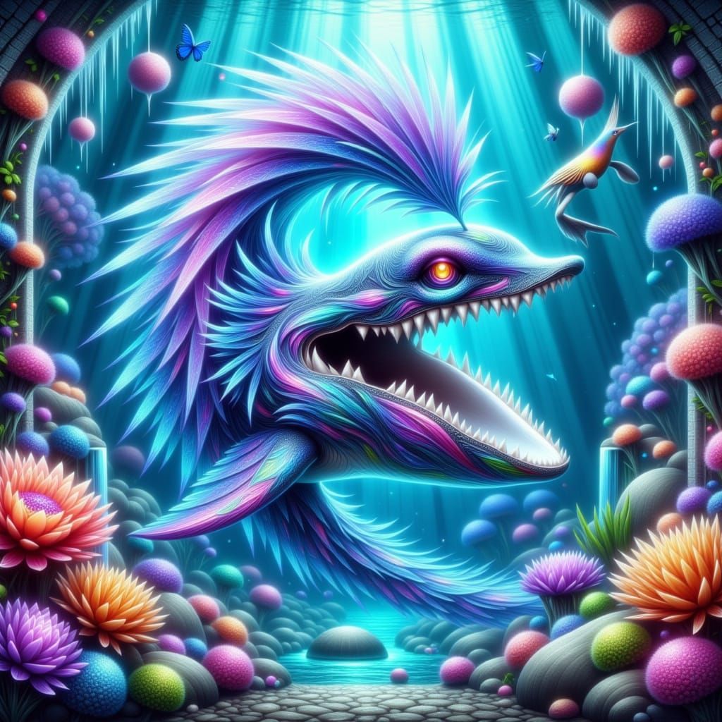 This image shows a majestic duck-shark hybrid swimming through vibrant, crystalline waters in the Atlantis Ruins, surrounded by a kaleidoscope of colors, including fluorescent coral and glittering gemstones, in a futuristic, dreamlike style
