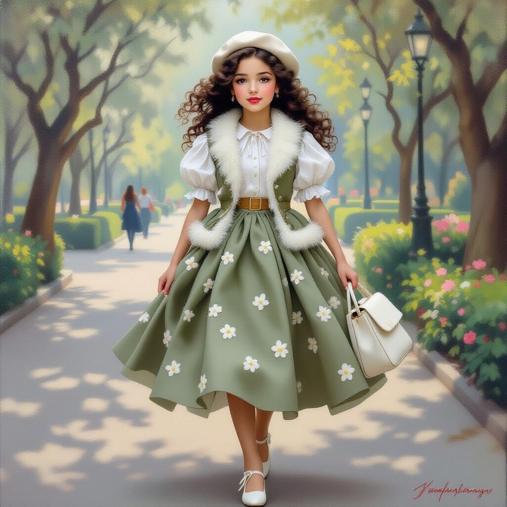 This image shows a glamorous young woman with dark curls in a park, wearing a fluffy fur vest and voluminous tulle skirt. Rendered in oil paint with soft, warm lighting.