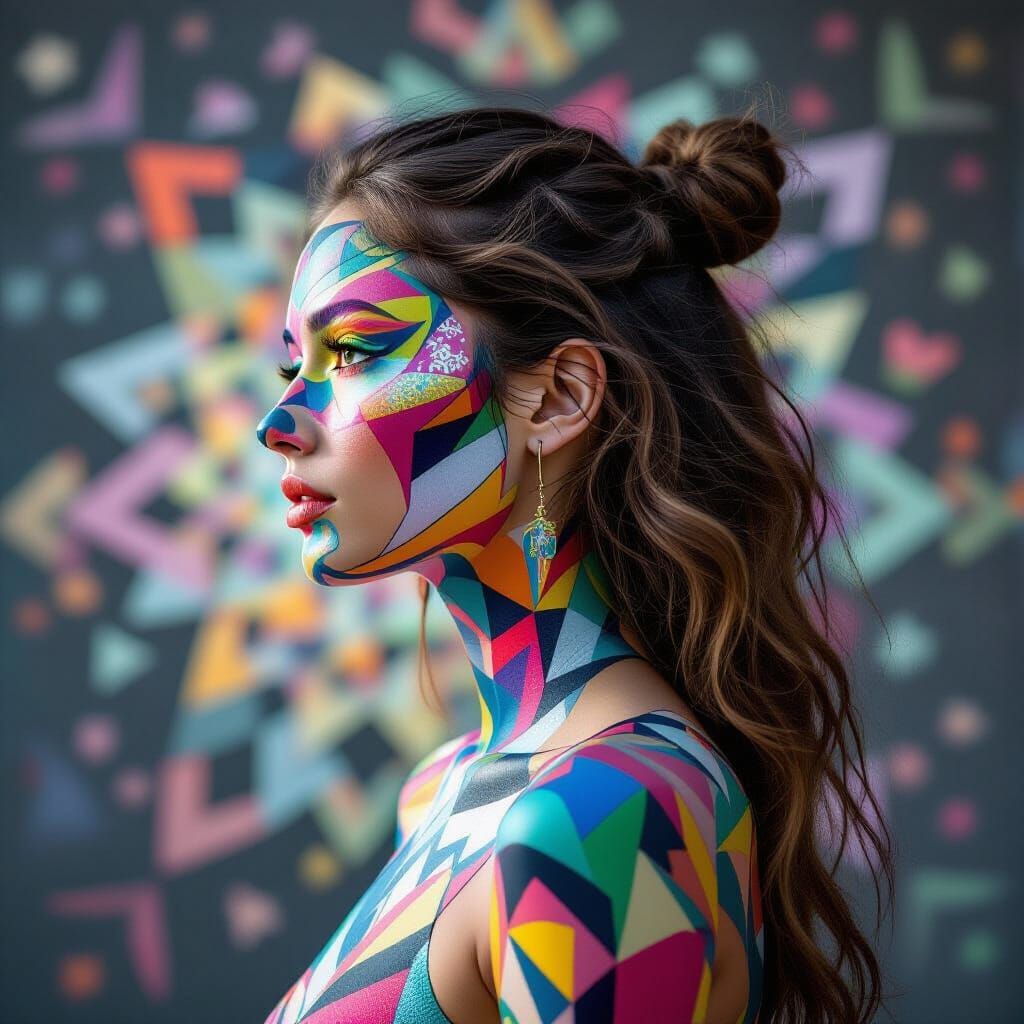 This image shows a young woman's profile adorned with vibrant, kaleidoscopic body paint. The dynamic shapes evoke a sense of tessellation and neon futurism.