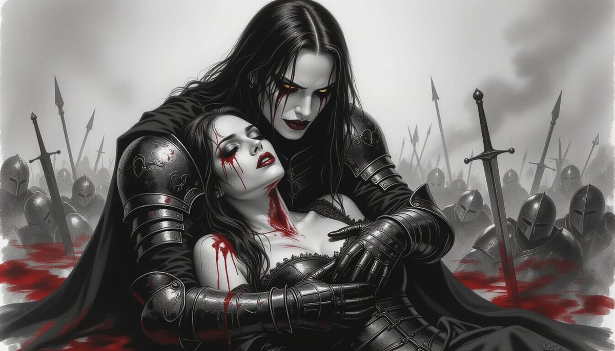 A hyper-realistic charcoal drawing of a gothic vampire knight cradling her dead lover. Dramatic lighting highlights her anguished expression of despair and rage on a bloody battlefield.
