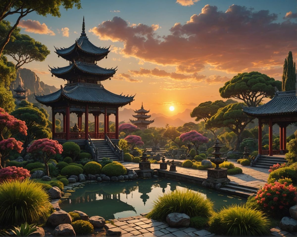 Create your own stunning oriental garden sunset scenes with our free AI image generator. It's easy and fast!