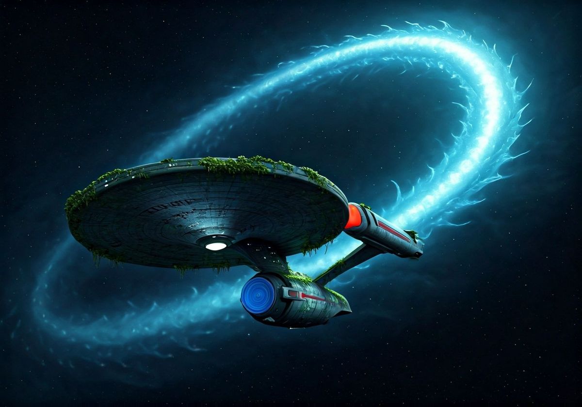 A derelict Star Trek ship overgrown with glowing alien plants drifts in a nebula resembling a sea serpent. Ancient runes pulse on its hull in this dark fantasy matte painting.