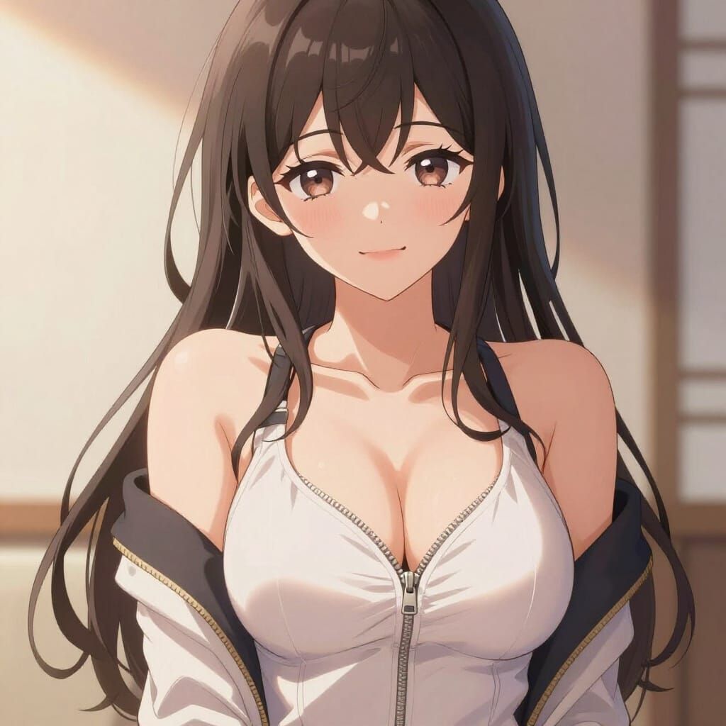 This anime art features a cute, confident woman with expressive eyes and a gentle smile, wearing a stylish outfit. The image uses warm lighting and a pastel palette for a romantic aesthetic.