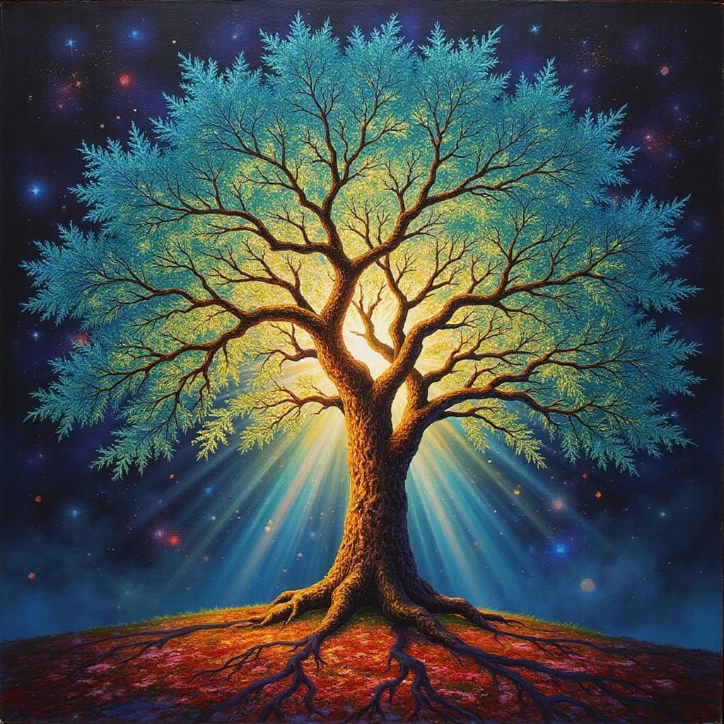 This image depicts a tree with an ethereal aura, its trunk, branches, and leaves composed of iridescent light, refracting a kaleidoscope of colors reminiscent of stained glass, with emerald green, sapphire blue, and ruby red hues.