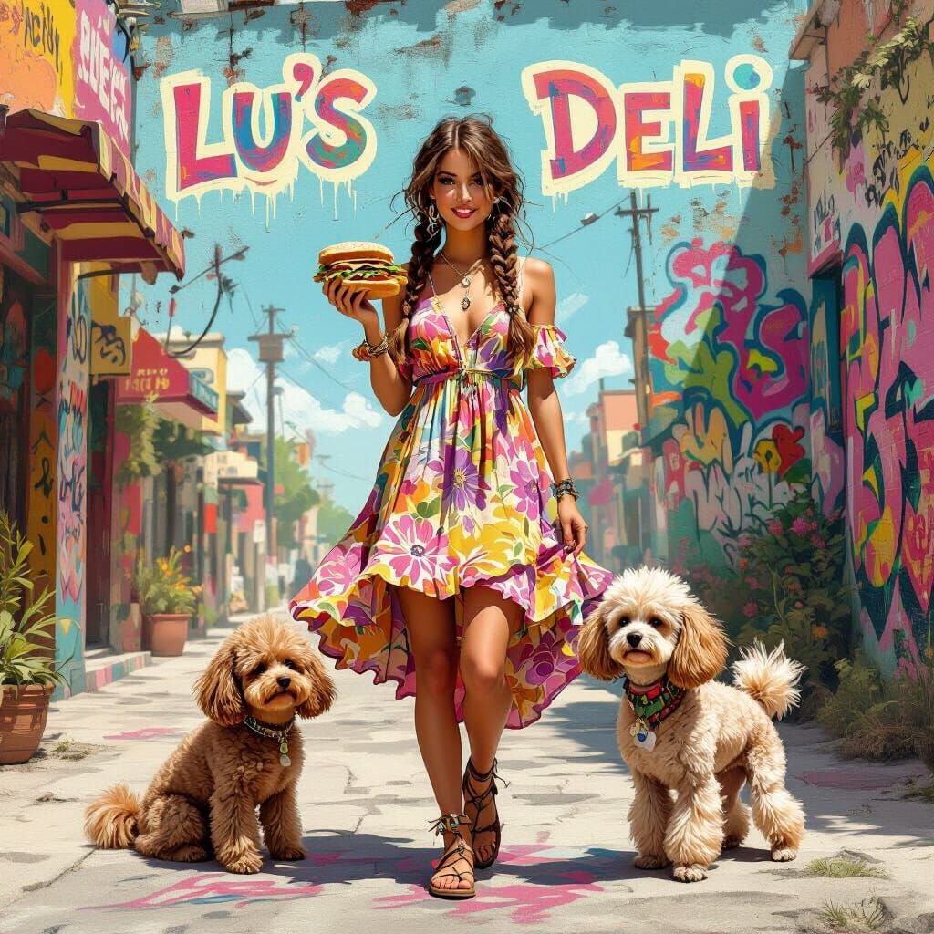 A vibrant image of a hippie woman with pigtails holding a sandwich against a graffiti wall. A Maltese poodle accompanies her in this urban scene with bohemian charm, reminiscent of digital artwork.