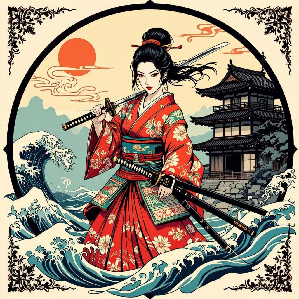 This image shows a Japanese ronin warrior woman in traditional clothing with a katana. Oriental patterns and waves surround her with a rustic house behind, in a tattoo flash style.