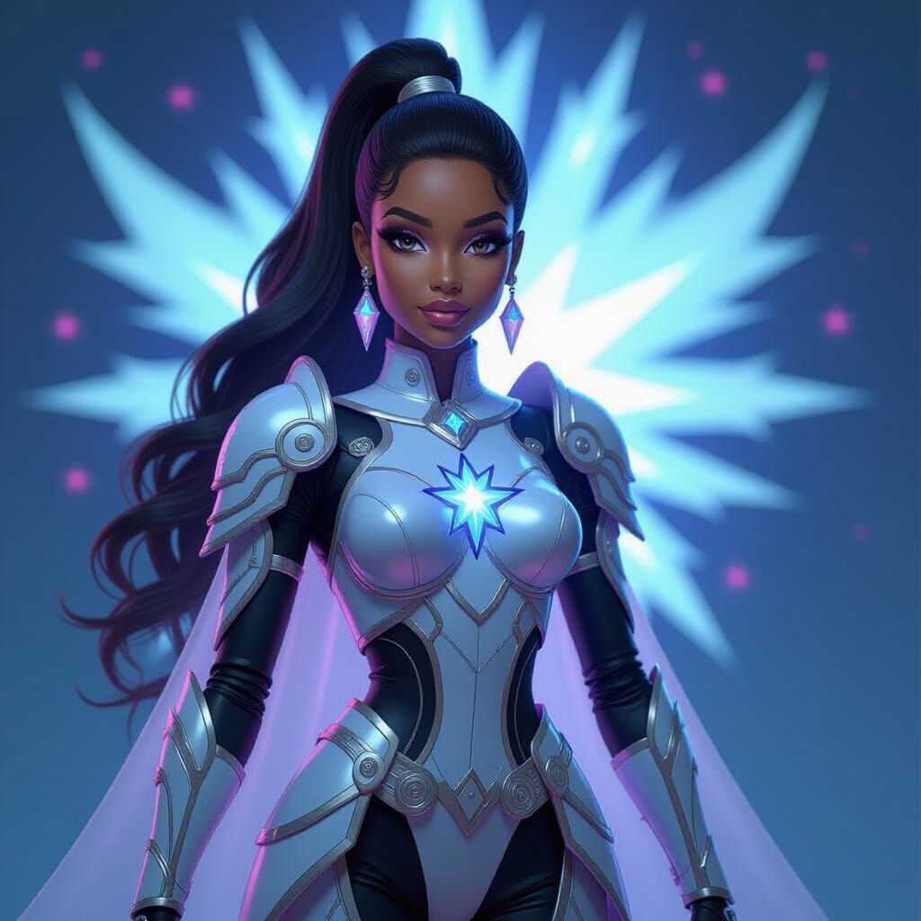 A portrait of an African American woman in celestial armor. The image is rendered with dynamic lighting and intricate detail, creating a blend of dark fantasy and futuristic elements as 8k resolution digital art.