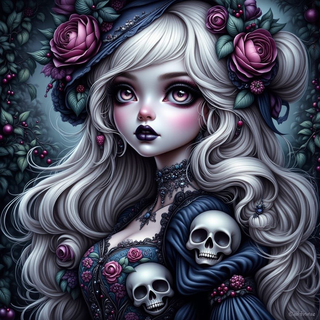 A beautiful, ghostly woman with white hair, adorned with skulls and spiders on her dress, with black lipstick, pale skin, and large eyes. This artwork is in the style of Jasmine Becket-Griffith and features a high level of detail in the style of dark whimsical <lora:Slightly Goth Whimsy:1.0> fantasy ...