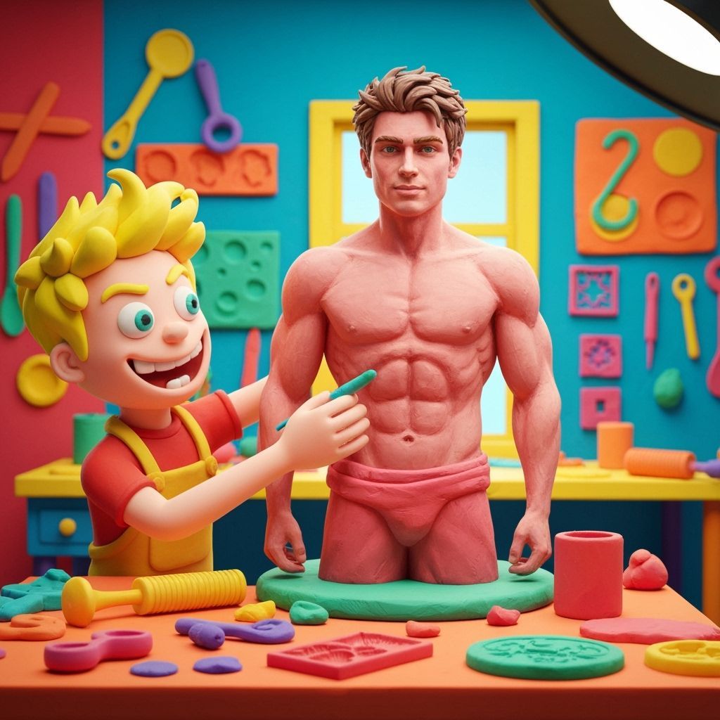 This image shows a Play-Doh sculptor in a brightly colored world, crafting a lifelike human figure. The vibrant scene, reminiscent of a children's book illustration, captures a playful and imaginative spirit.