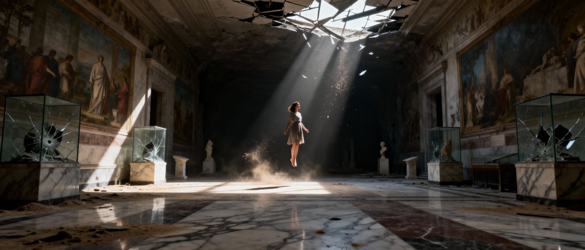 This photorealistic image shows a woman suspended above a marble floor in a vast, empty museum. Light streams through a broken skylight, illuminating dust and shattered display cases with dramatic shadows.