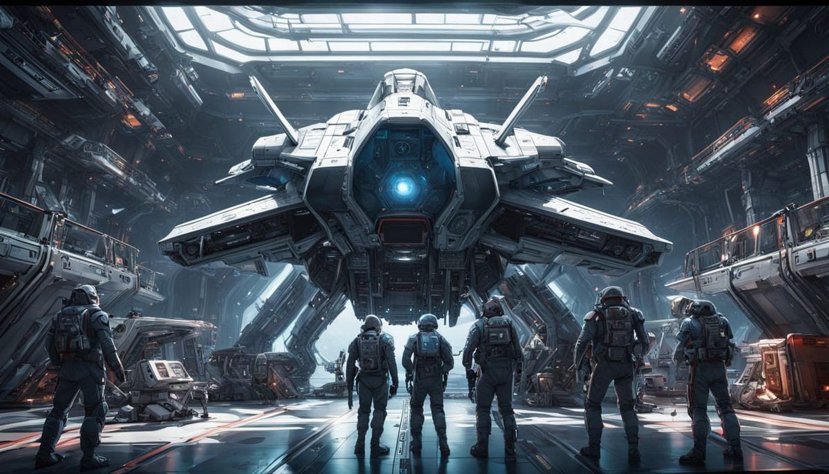 This cinematic film still features a detailed US spacecraft in the background, surrounded by US Space Marines and military scientists. A tall, blonde officer and his female co-pilot stand alongside an alien couple with striking blueish skin tones. The artwork showcases intricate details, triadic colors, ...