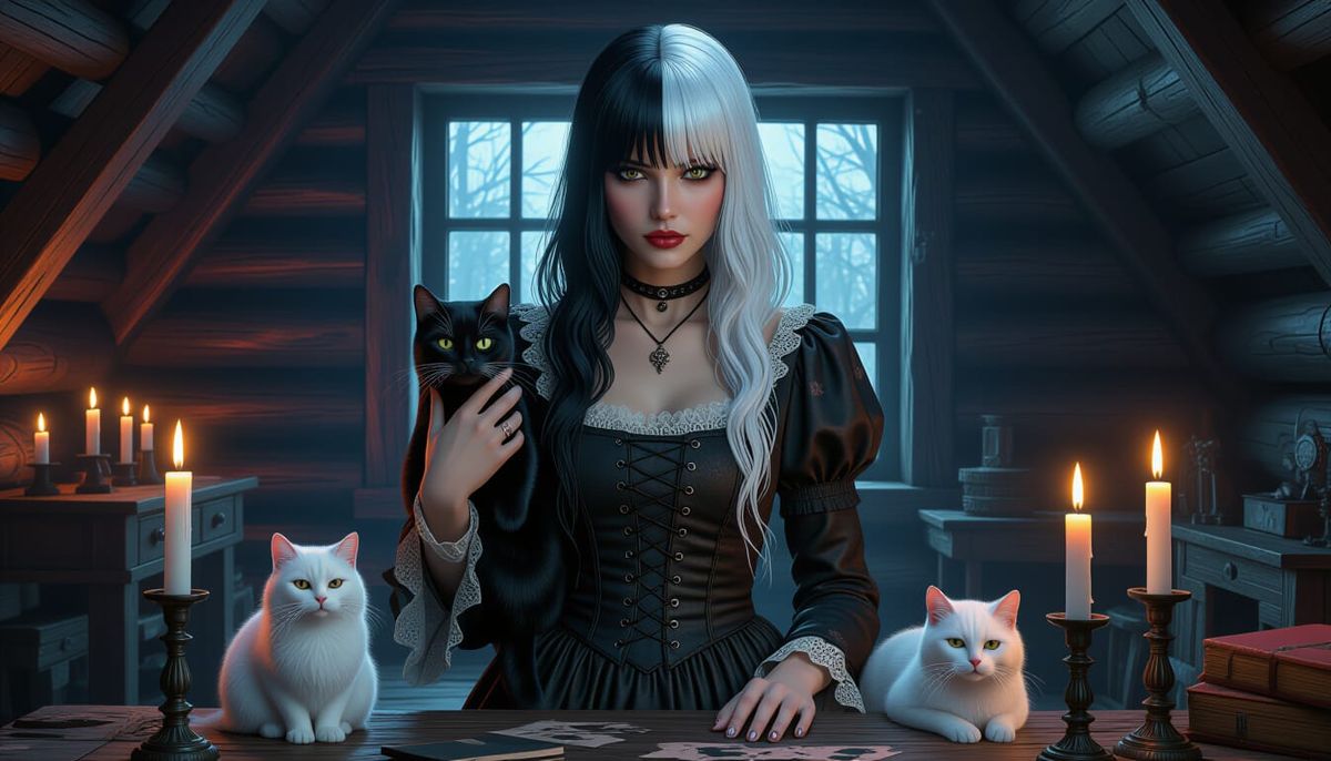 A hyperrealistic fantasy concept art piece showing a Wiccan woman with striking black and white hair, holding black and white cats in a rustic stone cabin illuminated by ethereal candlelight.