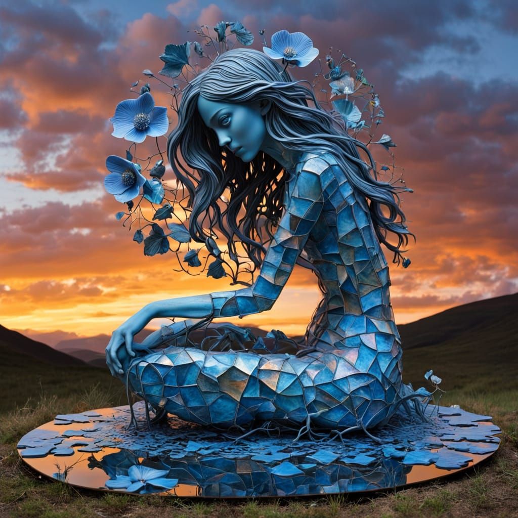 This enchanting mixed-media artwork features a mystical woman amidst a vibrant, surreal landscape. She gathers shards of broken mirrors, symbolizing her unbreakable spirit. The piece is a captivating blend of bio art, folklore, and mythology, with intricate details and abstract designs that evoke a sense...