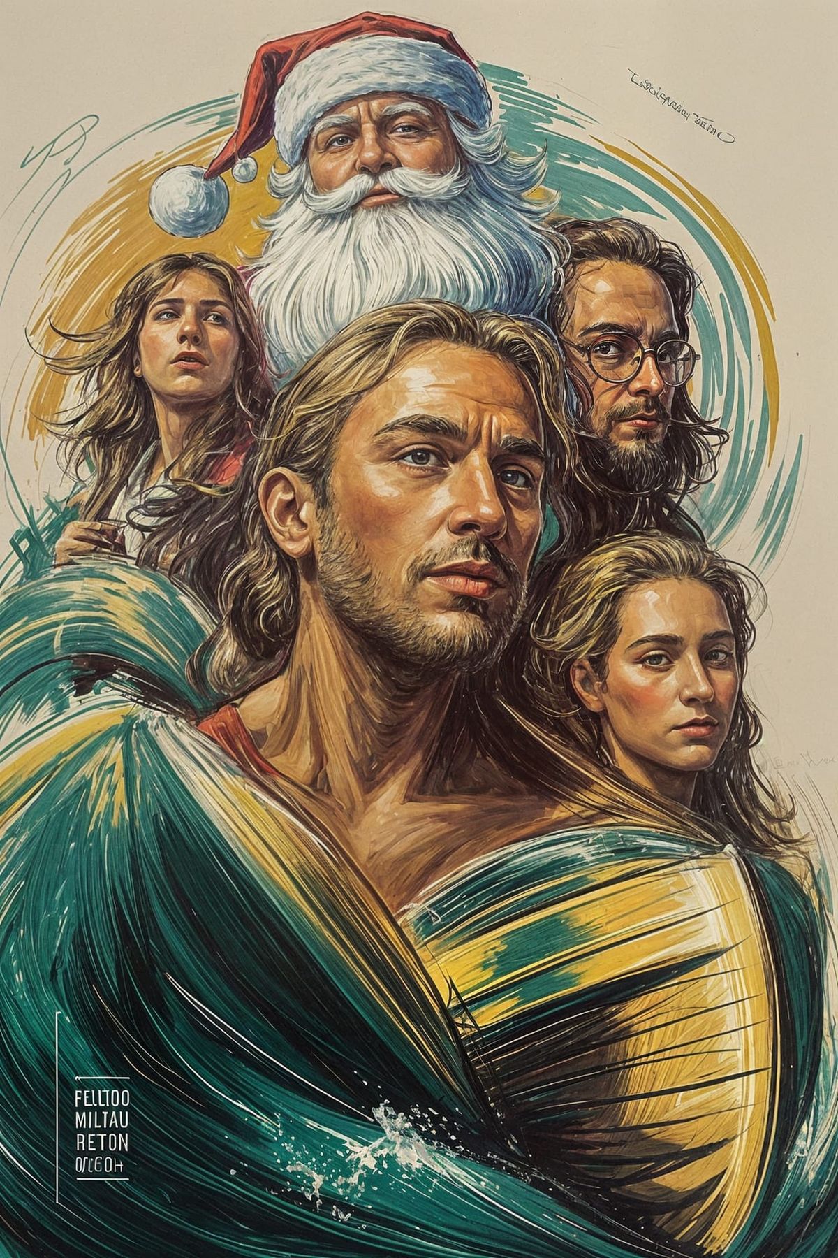 This image captures a whimsical scene of motorboat racers competing on Avenida Caracas, with Santa Claus soaring above in a dreamlike atmosphere reminiscent of Victorian era photographs, incorporating a split-complementary color palette and post-impressionist flair