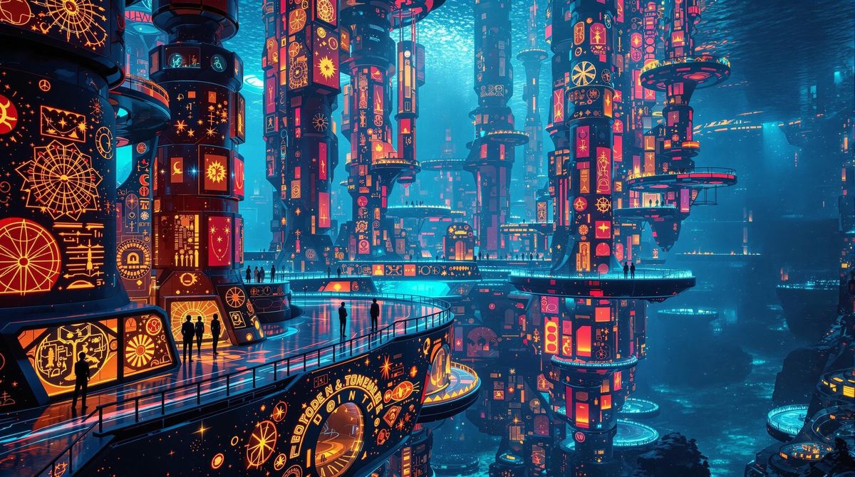 This image shows a breathtaking, hyper-realistic cityscape on a distant planet, with glowing panels and bioluminescent algae illuminating an underwater world, where aquatic and terrestrial life thrive in a truly alien environment.