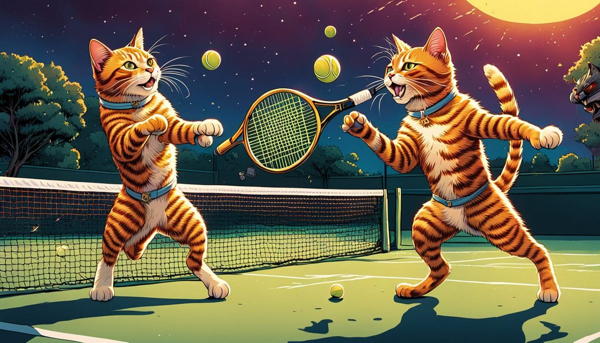 A vibrant comic book illustration of two stylish cats playing tennis, their whiskers twitching. The close-up shot emphasizes their glittering jewelry and the golden hour lighting.