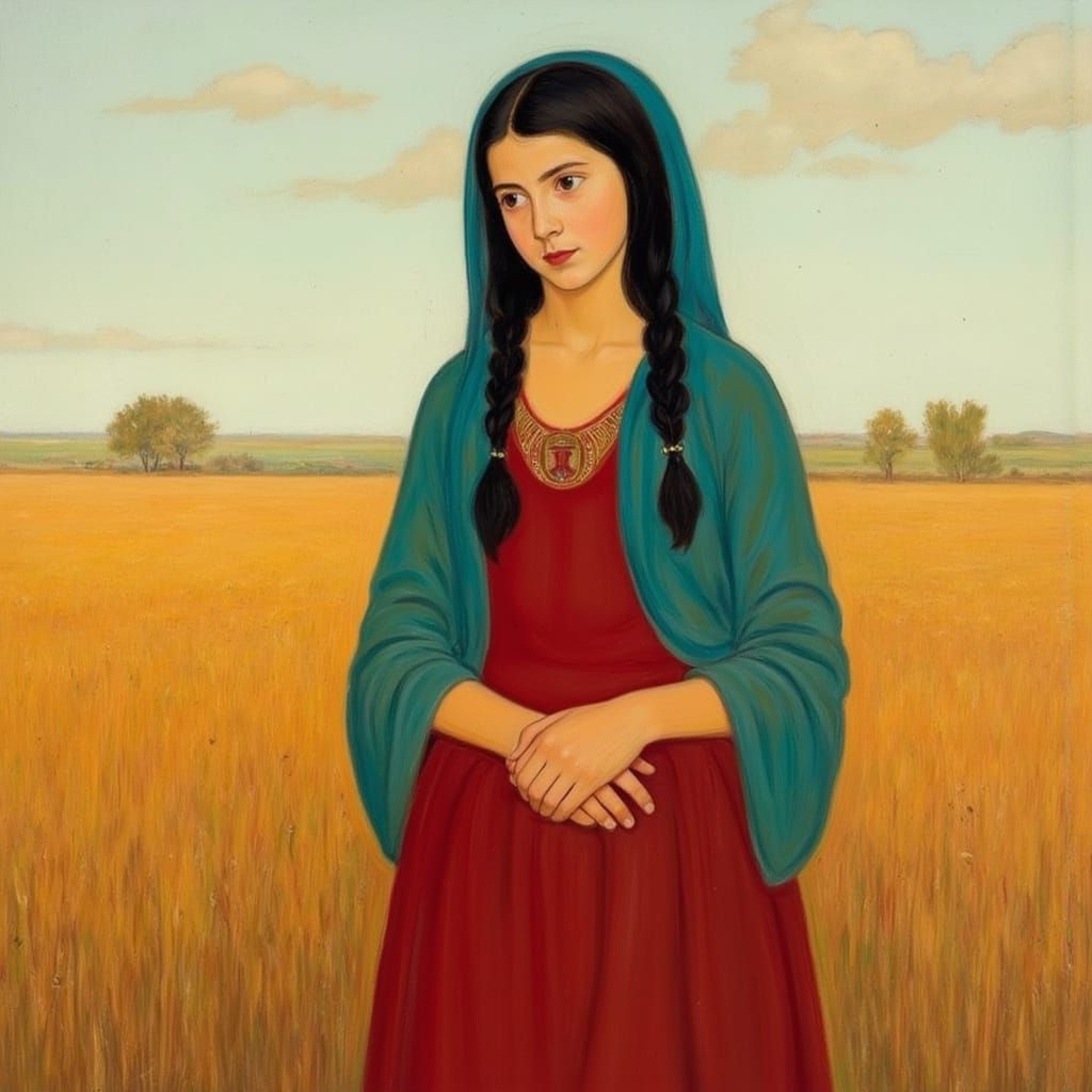 A beautiful girl with black hair, golden kokoshnik, and red sarafan stands in a wheat field at sunrise. The image features soft lighting and analogous colors in a minimalist composition.
