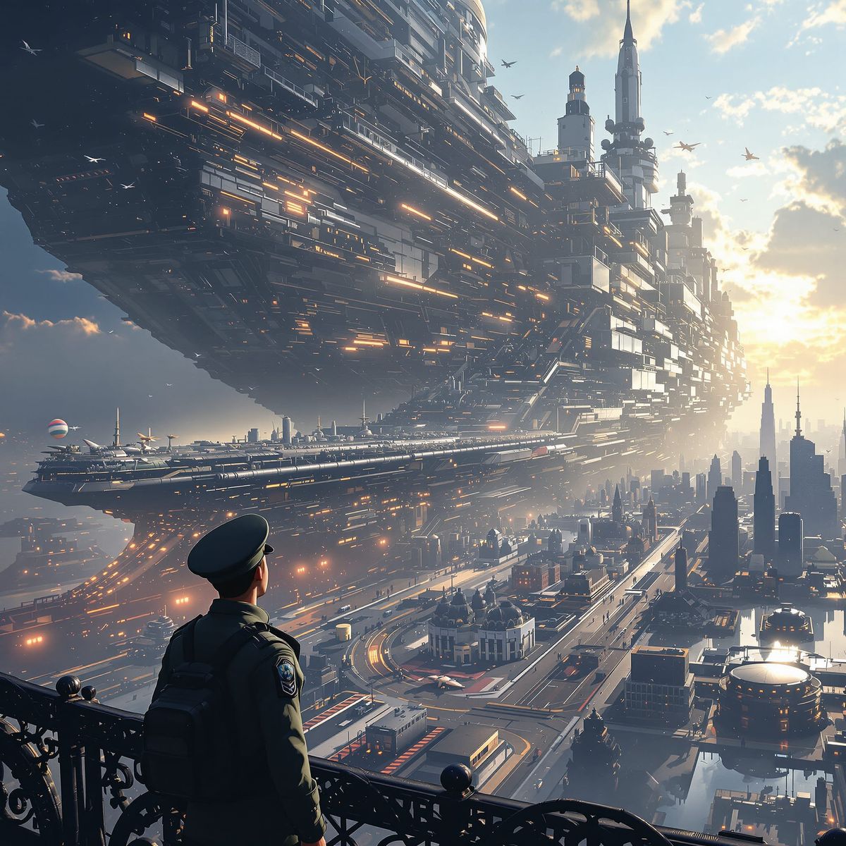 This image shows a young soldier in awe of a colossal, city-filled battleship. Rendered with hyperrealistic detail, sharp focus, and high contrast, it captures an expansive, intricate urban environment within the vessel.