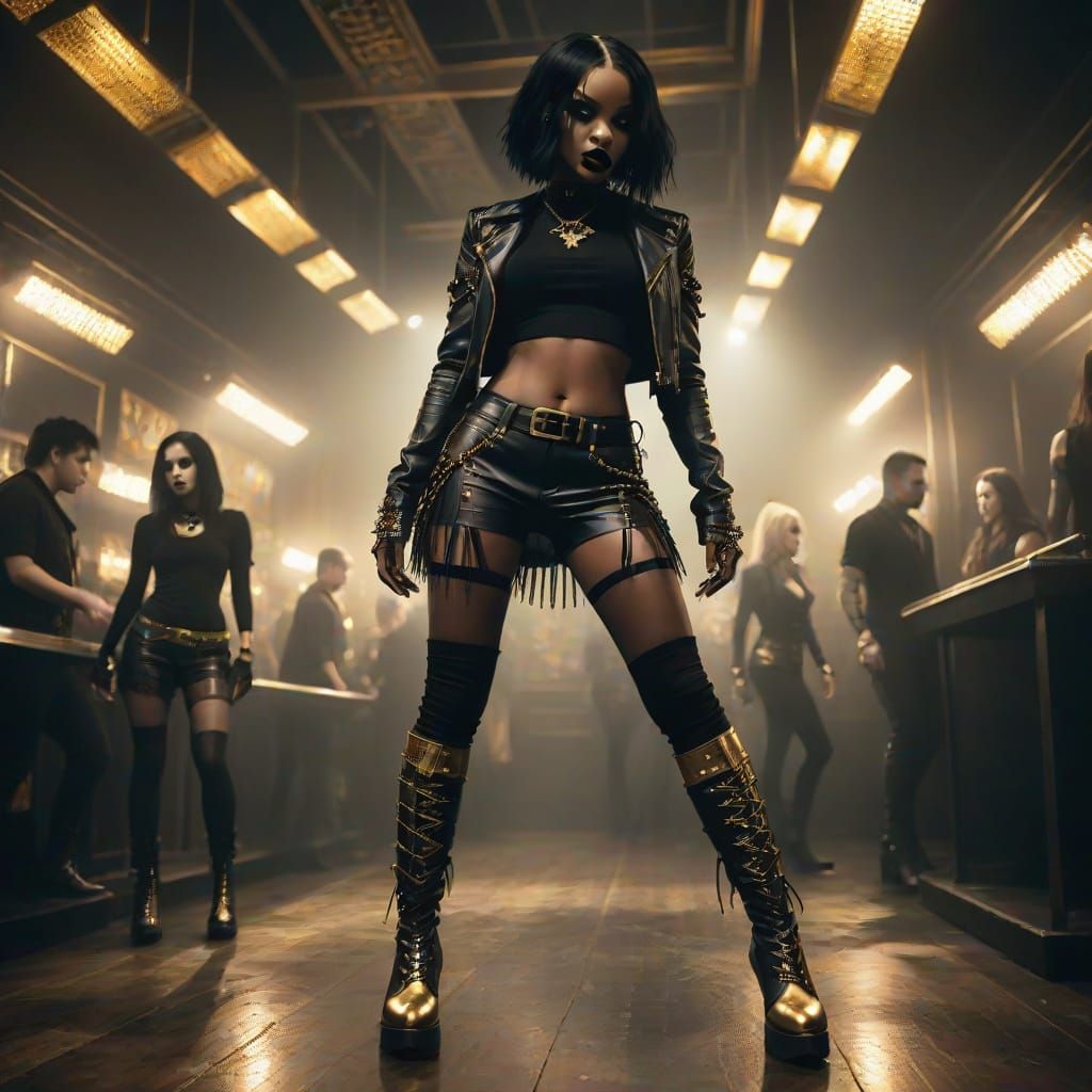 This image captures a dramatic moment of a goth girl dancing in a night club, surrounded by other goths in dark attire, with bold fashion and intricate details that reflect the moody, atmospheric setting.