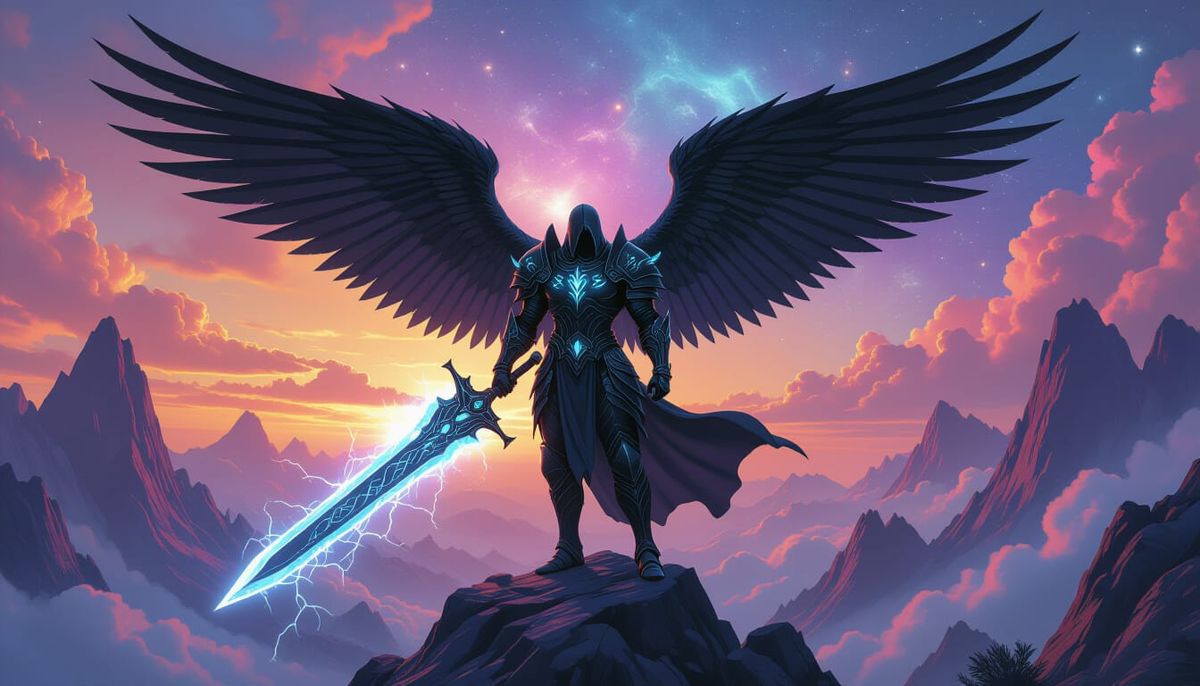 This image depicts a fallen angel warrior in obsidian armor with glowing runes, standing on a mountain. The warrior wields a powerful sword against a cosmic backdrop, rendered with extreme detail and cinematic lighting.