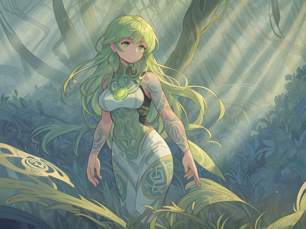 A stunning portrait of a confident woman adorned with Celtic tattoo art, set amidst the lush beauty of an Irish island. Blending retrofuturistic and biopunk elements, this artwork exudes mystique and wonder.
