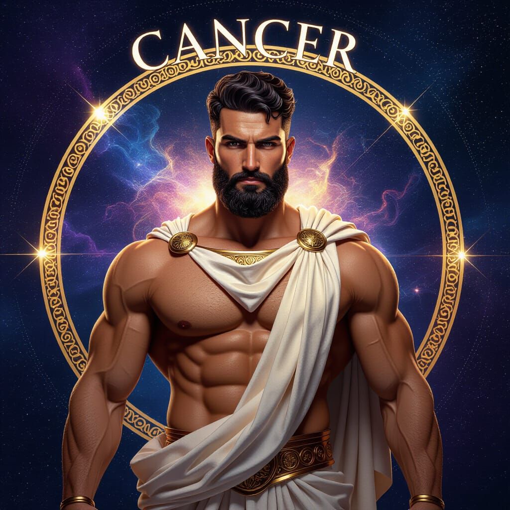This image features a sensual, masculine anthropomorphic cancer archetype in classical Greek attire, set against a cosmic backdrop. Rendered as a vibrant, holographic mixed media illustration with celestial elements.
