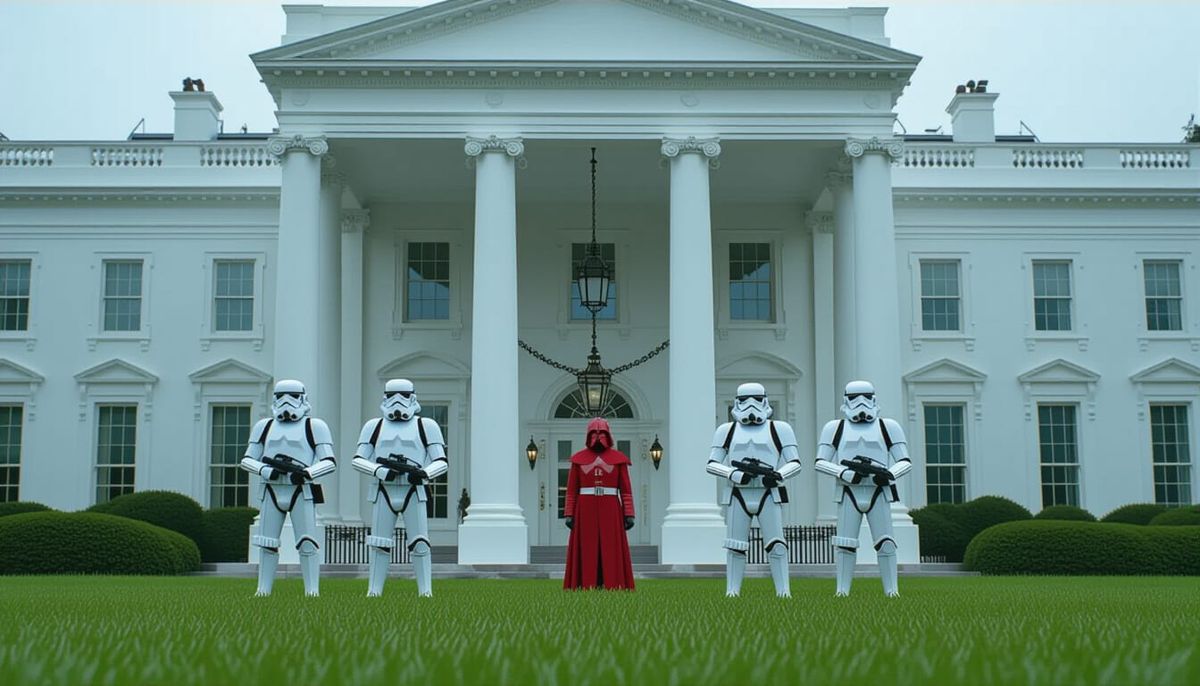 This image shows Star Wars stormtroopers guarding the White House entrance with a red Imperial Guard. Cinematic lighting and film grain create an atmospheric, dramatic quality.