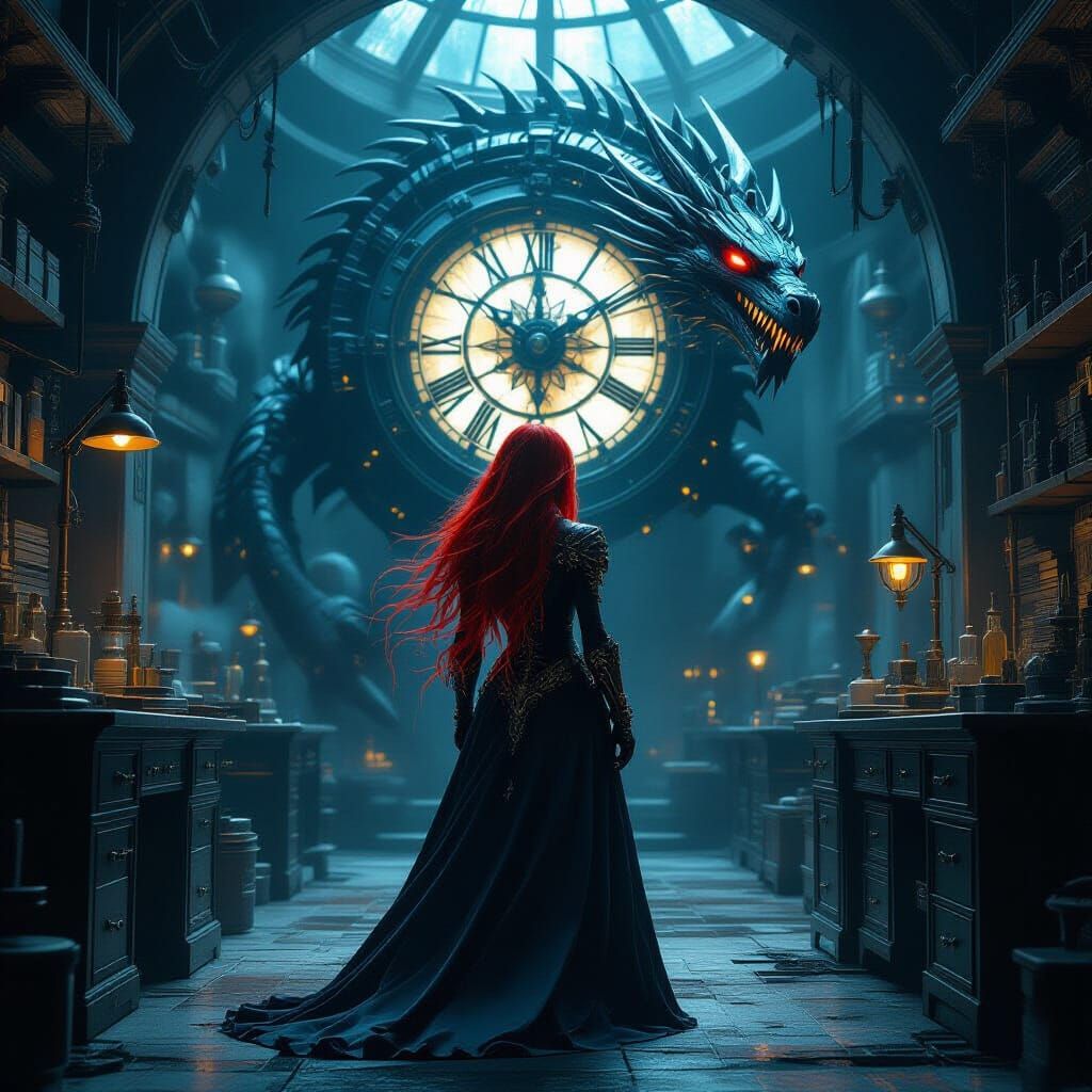 This image shows a gothic artificer with flowing neon-red hair and cybernetic enhancements, standing before a clockwork dragon in a dimly lit laboratory. The artwork has dark fantasy and art nouveau elements.