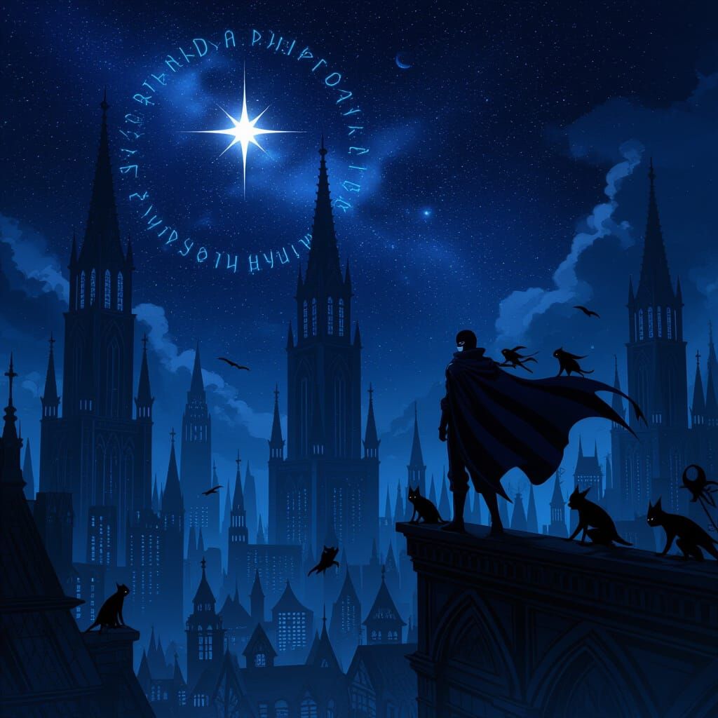 This image depicts a dark anime fantasy city with gothic towers under a starry sky. Luminous runes float around shadowy creatures, and a masked vigilante stands on a spire, rendered in a dramatic art style with deep blues and purples.