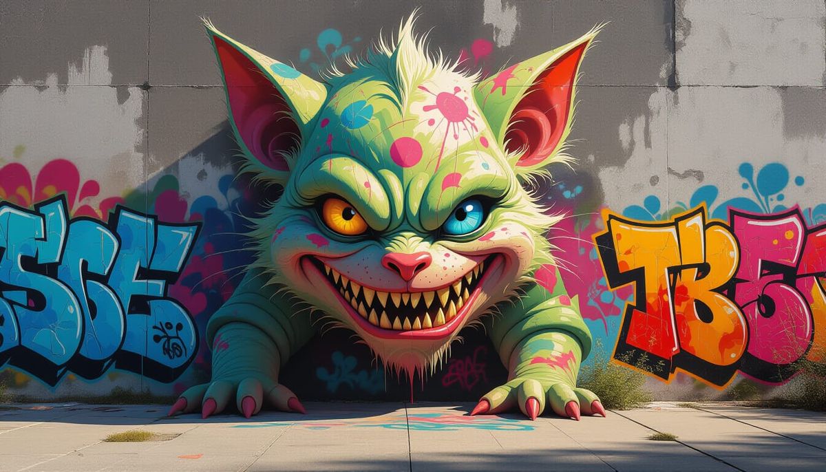 A vibrant graffiti art image of a fantastical creature embodying both youth and old age. The hybrid form blends peaceful and ferocious elements with polychromatic colors and ultra-realistic details.