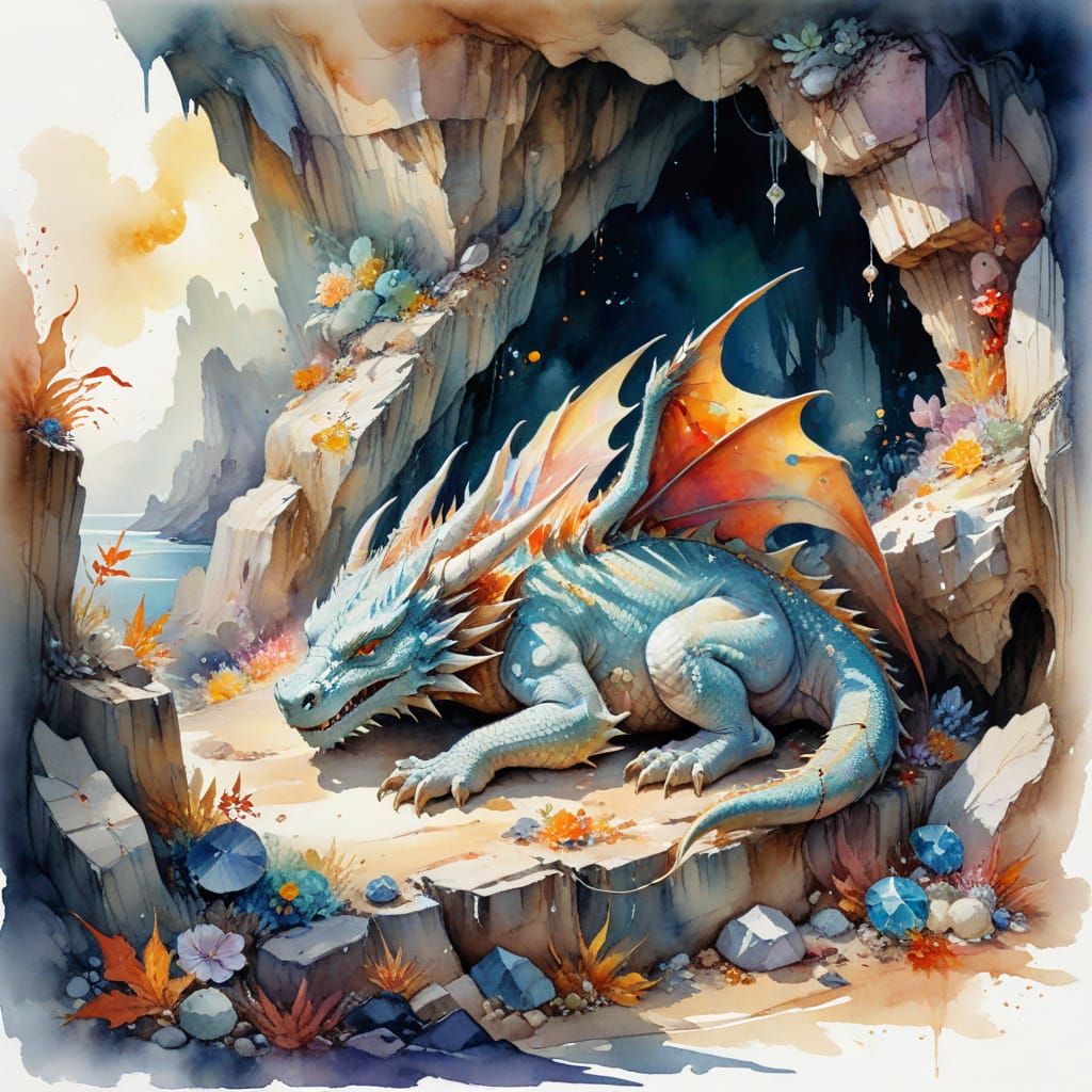 A watercolor painting of a dragon asleep on a hoard of treasure inside a cave. The artwork has a painterly aesthetic and uses dynamic composition to create a sense of depth.